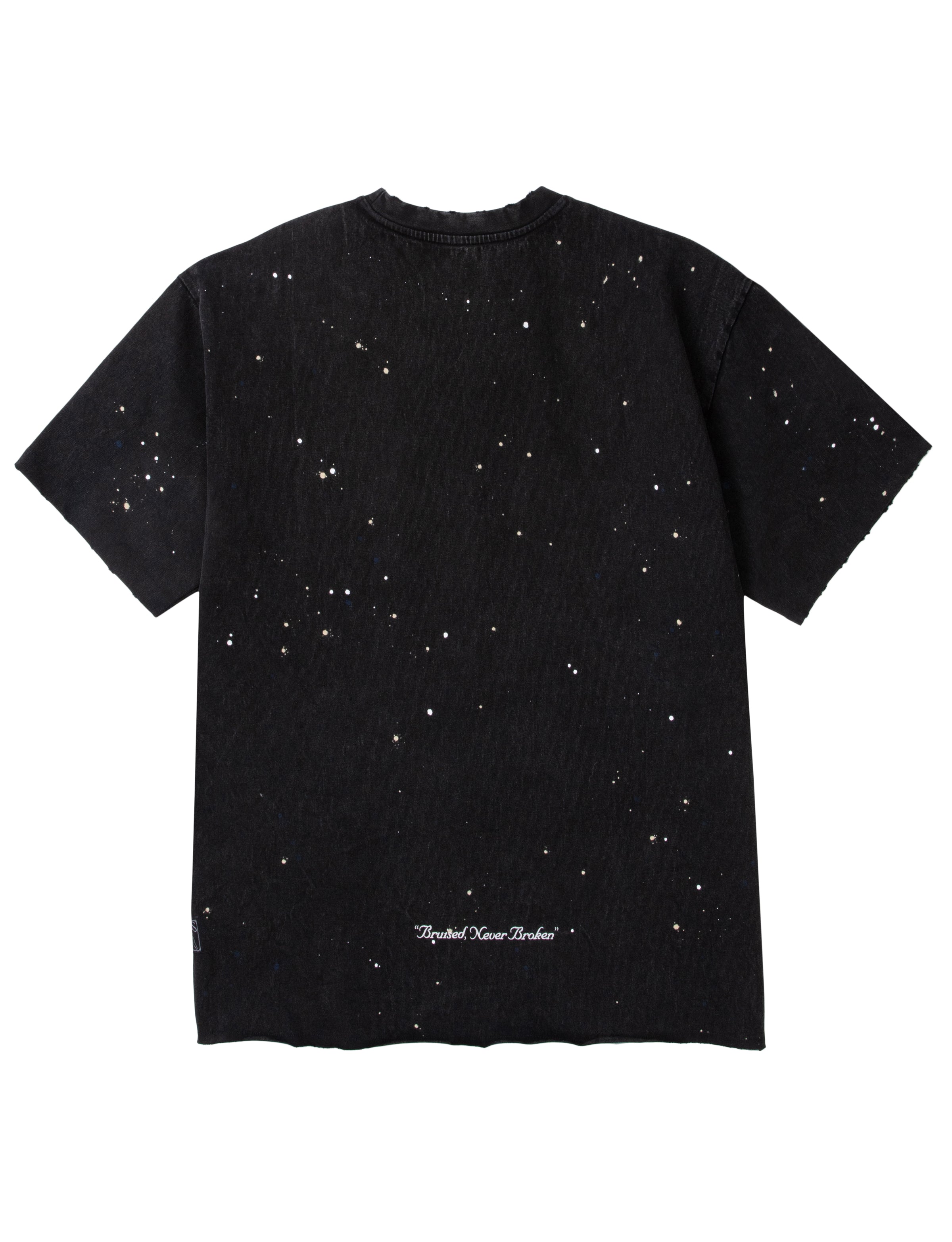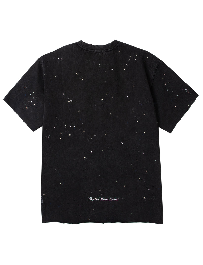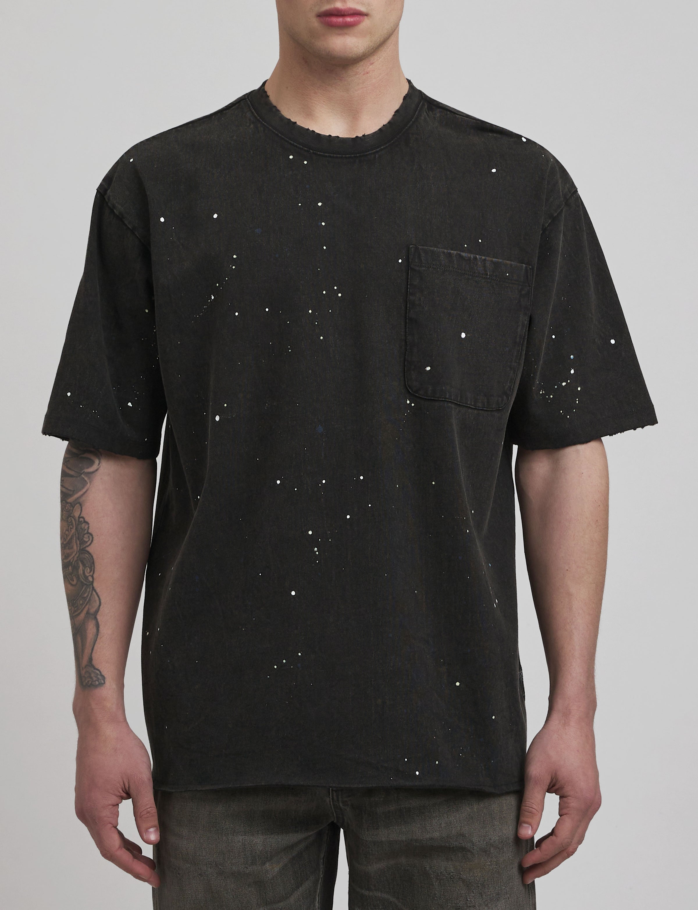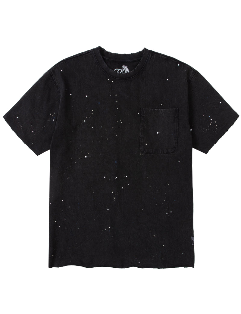 The Hiroshima Tee is crafted from heavyweight jersey in our signature mineral wash. It features an oversized boxy fit with a chest pocket, bleach spots and paint-splattered details.