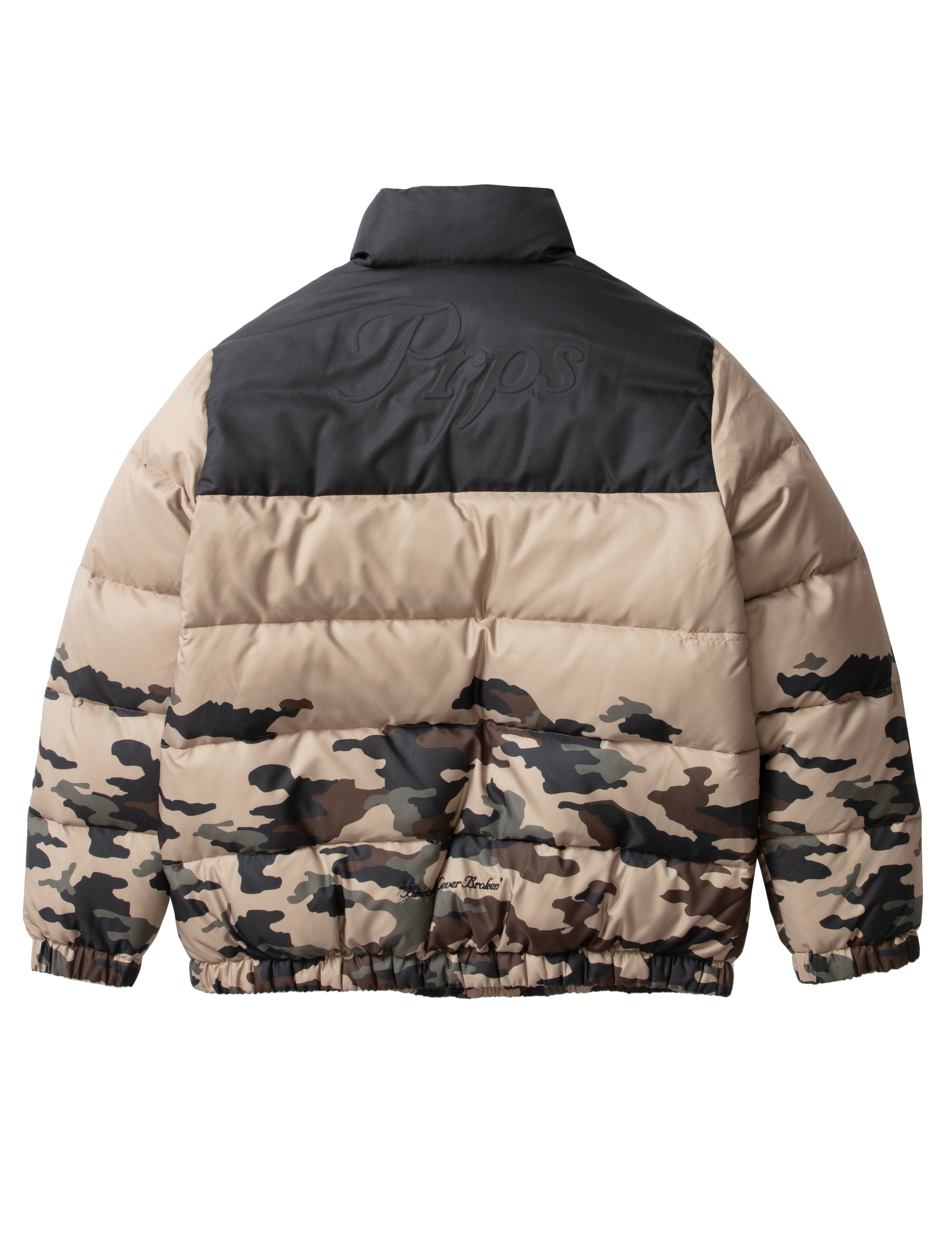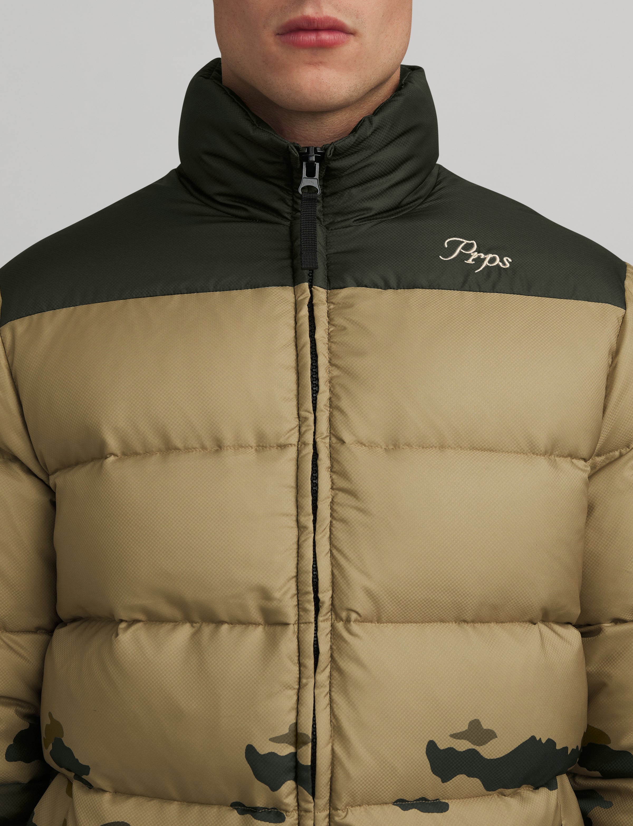 The Madchester Jacket is a down-filled puffer jacket with an engineer camo print, a contrasting yoke detail and an embossed PRPS print on the back.